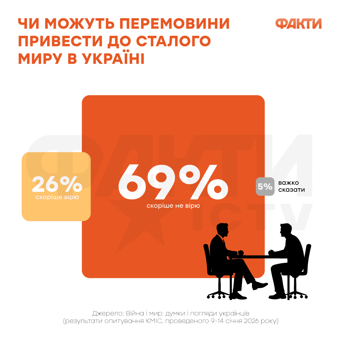 По данным опроса КМИС, 69% людей не верят, что нынешние переговоры приведут к устойчивому миру.