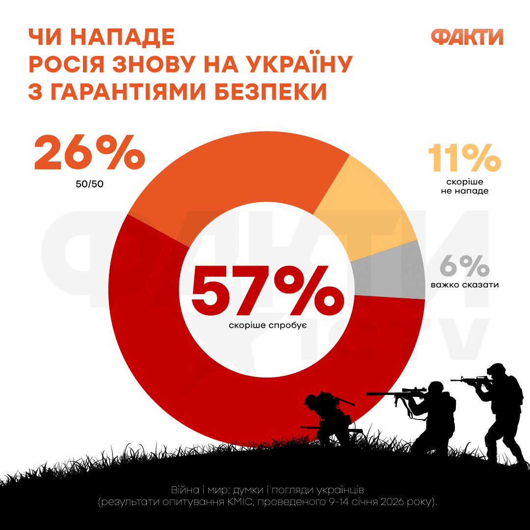 Однако 57% украинцев ожидают, что даже в случае “замораживания“ по нынешней линии фронта и с гарантиями безопасности Российская Федерация все равно попытается повторно напасть на Украину.