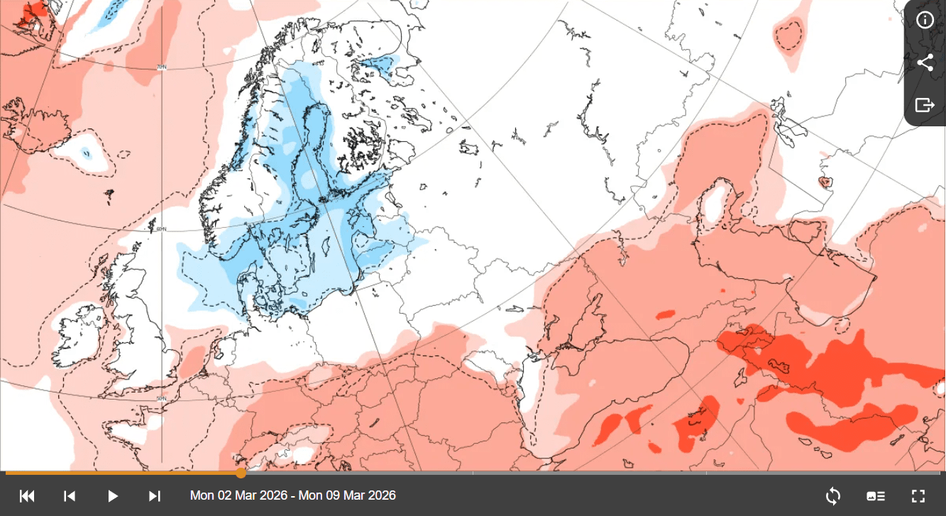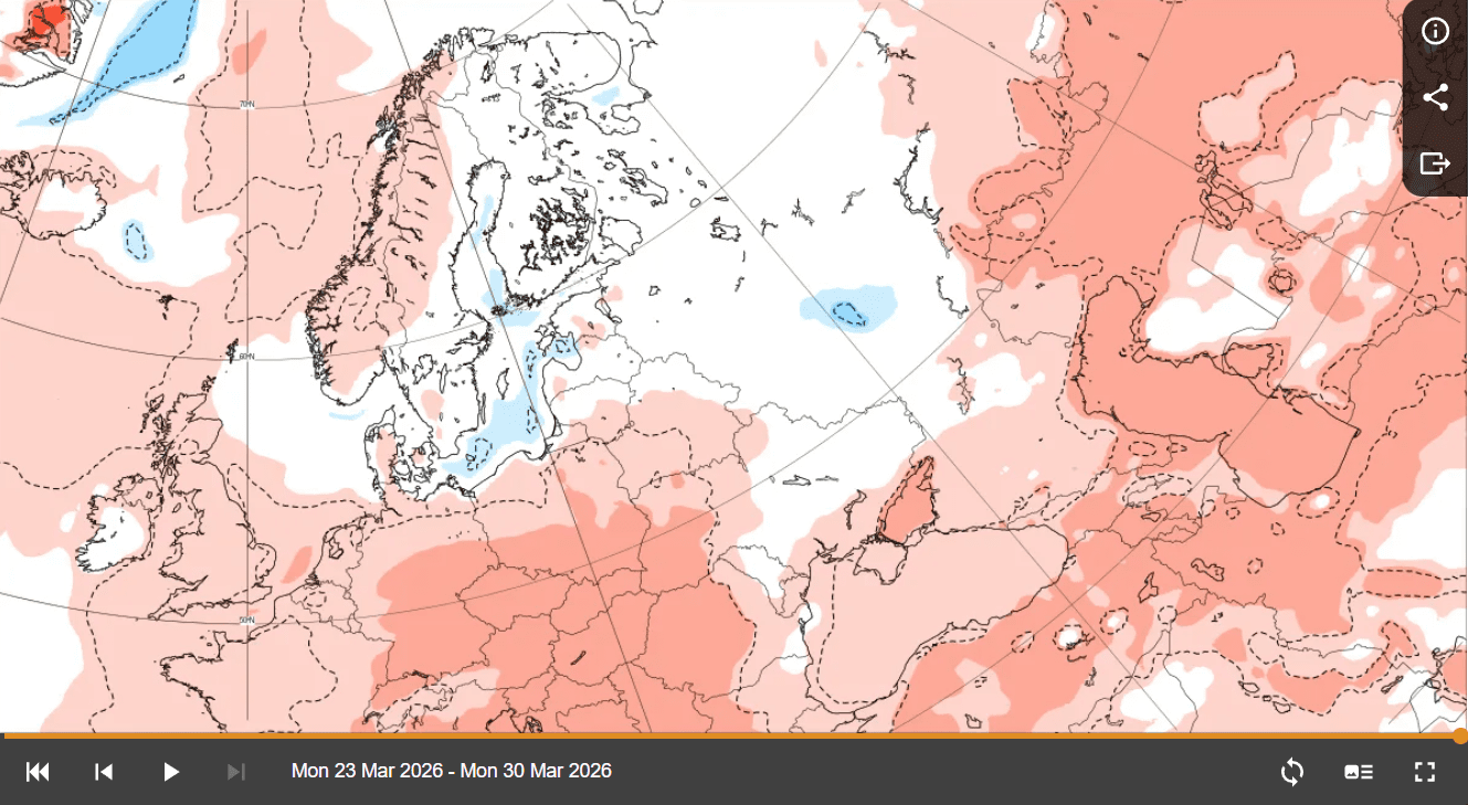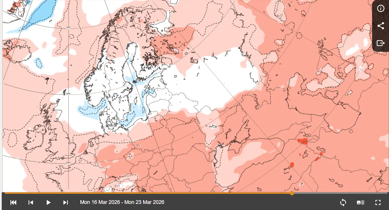 Согласно последним сезонным прогнозам ECMWF, март 2026 года вероятно будет теплее многолетних климатических норм для большей части Европы, включая Украину.