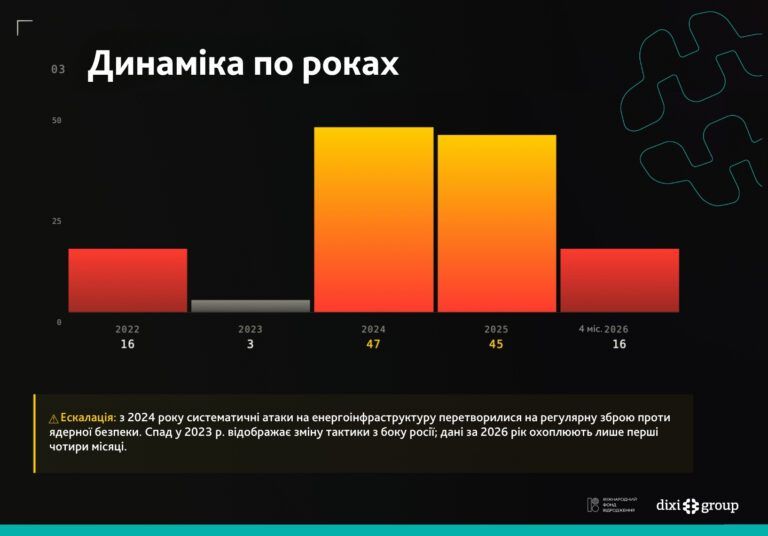 Так, в своем материале к 40-й годовщине аварии на ЧАЭС аналитики DiXi Group подсчитали, что за более четырех лет полномасштабной войны в Украине россияне повлекли по меньшей мере 127 событий, которые ставили под угрозу ядерную и радиационную безопасность и были подтверждены отчетами МАГРЭТ Украины и официальными.