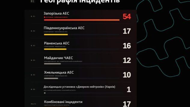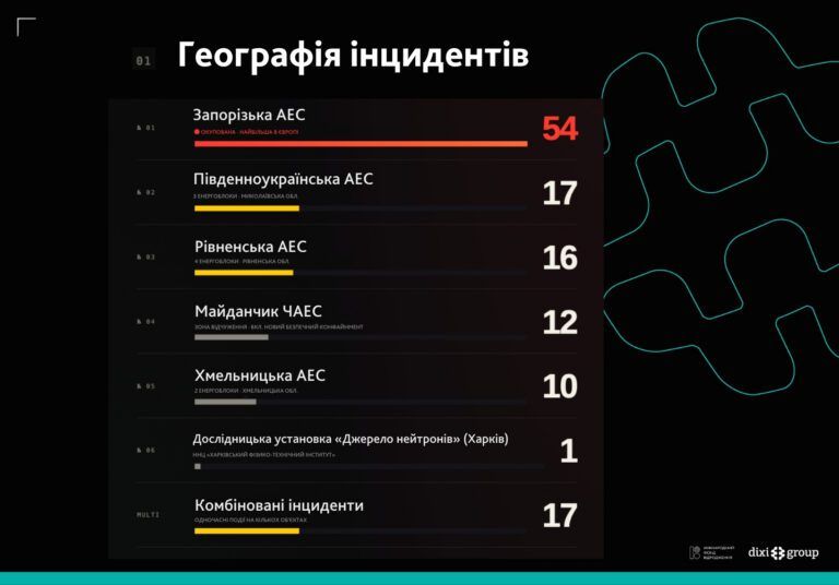 - 54 инцидента, или 42,5% от общего количества, пришлись на Запорожскую атомную электростанцию.