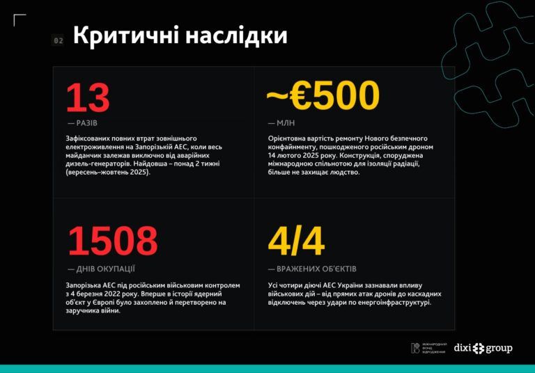 - 29 временных снижений выходной мощности АЭС из-за нестабильности энергосистемы в результате атак;