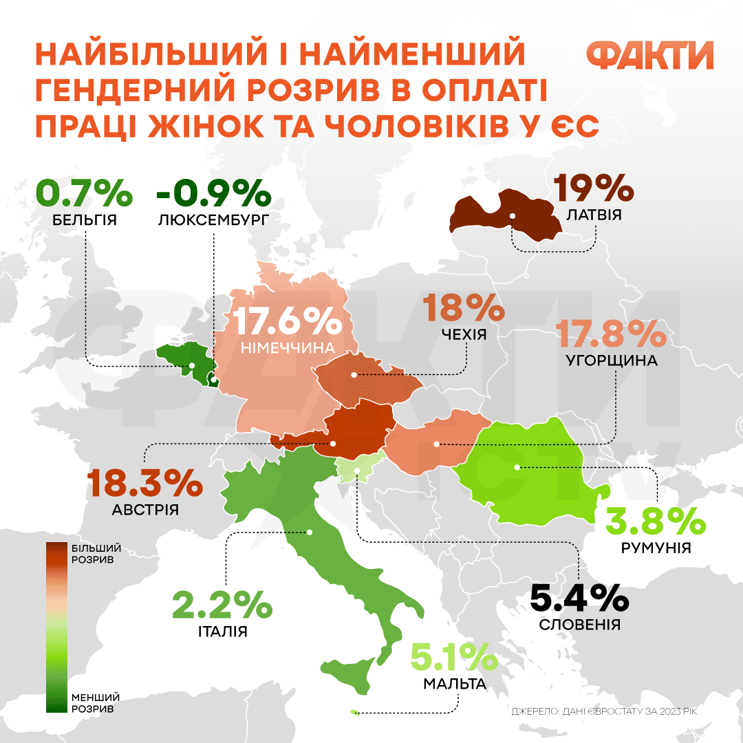 Самый большой и самый маленький гендерный разрыв в оплате труда женщин и мужчин в ЕС. Инфографика: Факты ICTV