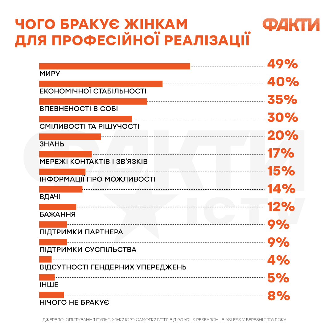 Для карьерного роста около 49% украинских женщин не хватает мира, а 40% — экономической стабильности. Об этом свидетельствуют результаты опроса Пульс женского самочувствия, проведенного Gradus Research вместе с Biasless в марте 2025 года.