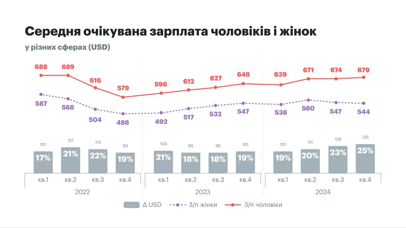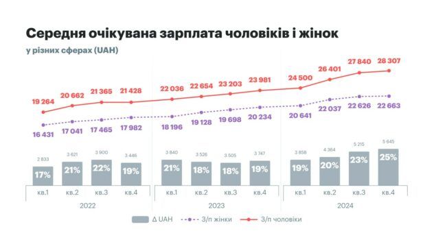 Аналитики robota.ua исследовали динамику изменений средней ожидаемой зарплаты среди мужчин и женщин. В фокусе — как эти показатели изменились в национальной валюте (гривнах) и в долларовом эквиваленте.