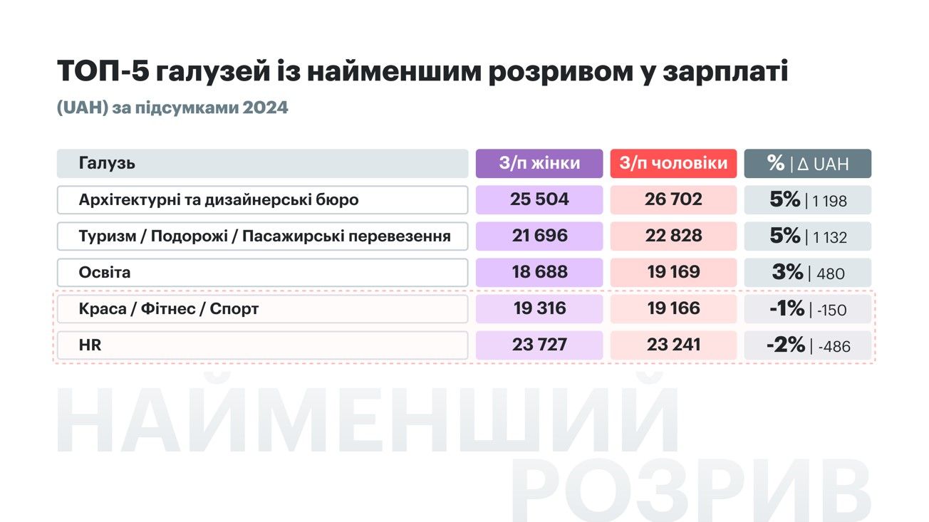 Как сообщают аналитики robota.ua, наименьший гендерный разрыв в оплате труда наблюдается в сферах, где традиционно работает больше женщин. К таким отраслям относятся архитектурные и дизайнерские студии, туризм и пассажирские перевозки, образование, индустрия красоты и спорта, сфера управления персоналом (HR).