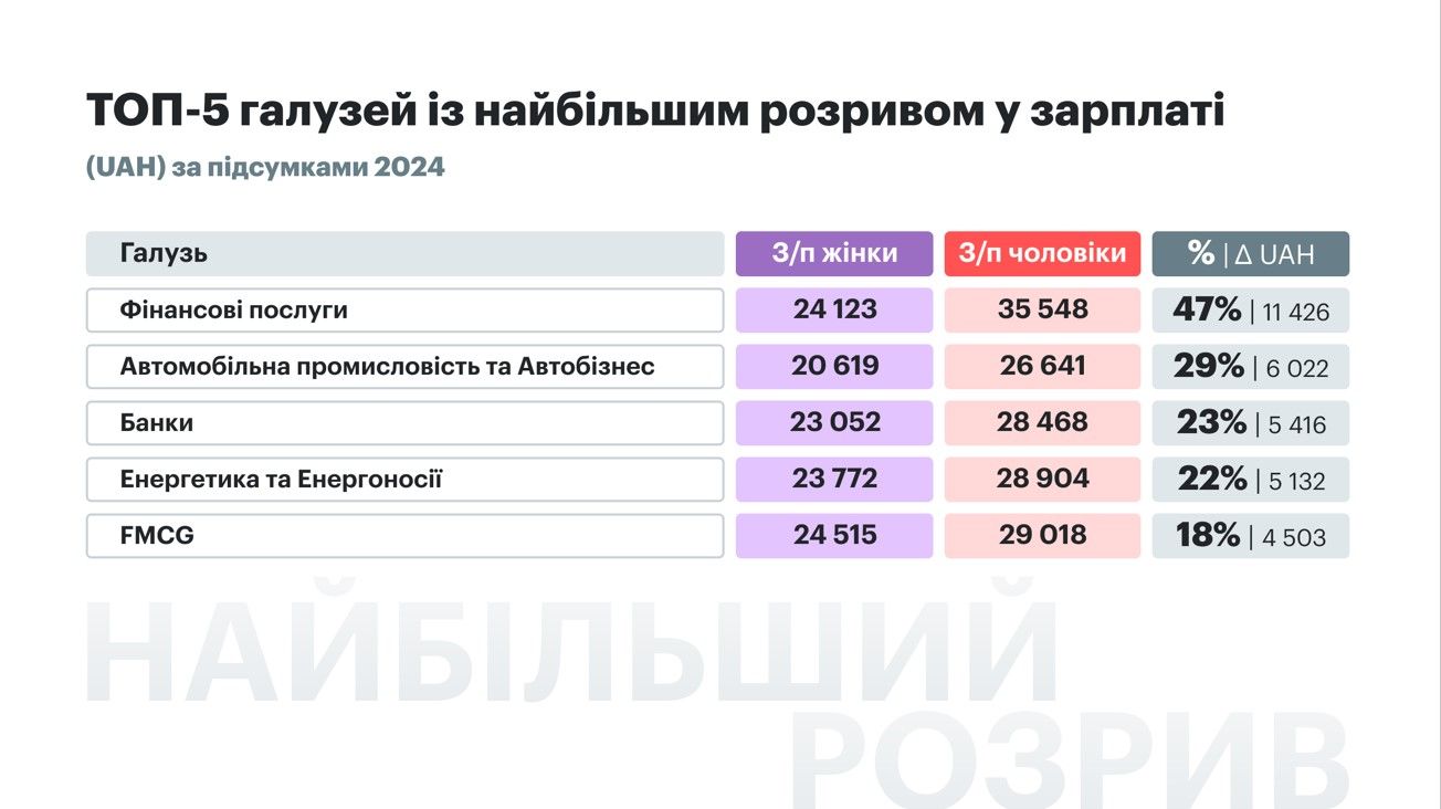 Согласно аналитике robota.ua, наибольший гендерный разрыв в зарплатах в Украине фиксируется в ряде высокодоходных отраслей. Наиболее ощутимая разница между оплатой труда мужчин и женщин наблюдается в финансовом секторе, банковской сфере, автомобильном бизнесе, энергетике и индустрии товаров повседневного спроса (FMCG).