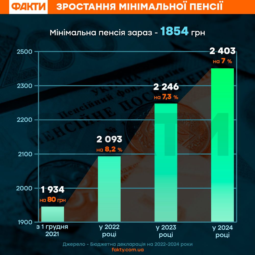 Именно таким, согласно Бюджетной декларации, будет прогнозируемый прожиточный минимум для лиц, утративших трудоспособность, который и влияет на размер минимальной пенсии.