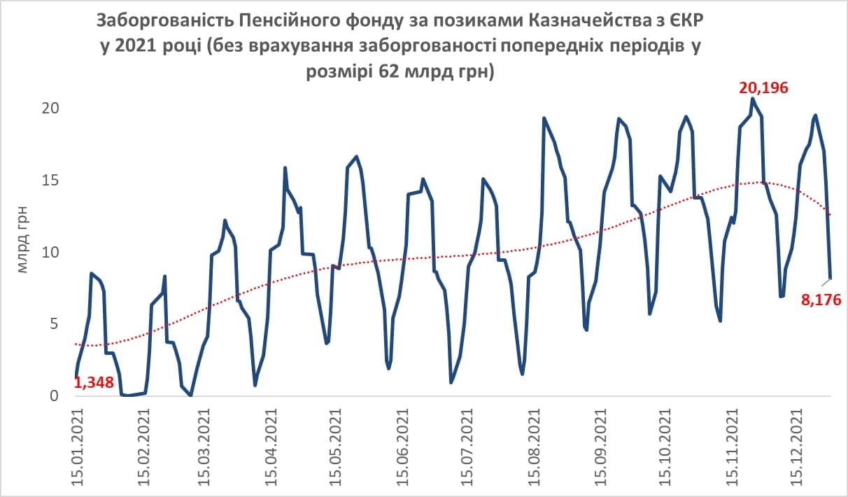По состоянию на 01 января 2022 года задолженность Пенсионного фонда перед ЕКР составила 70 млрд грн. За 2021 год она увеличилась на 8,2 млрд.