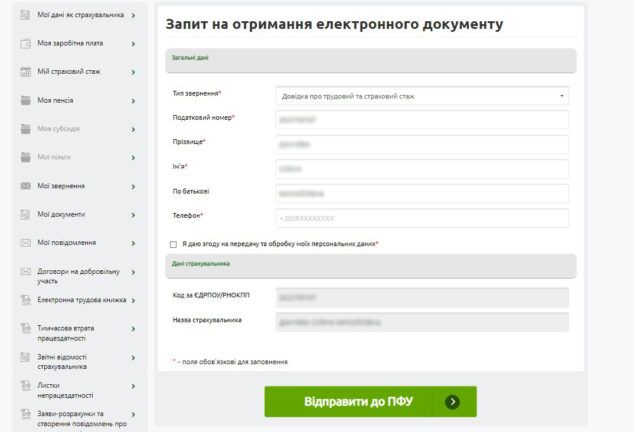 - Проверить, правильно ли внесены ваши данные, и выбрать из списка тип обращения – Справка о трудовом и страховом стаже.