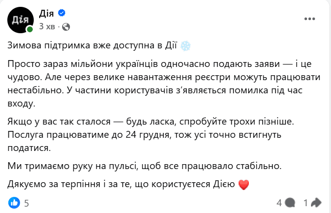 - 15 ноября стартовало оформление Зимней поддержки: в приложении Дія фиксируется сбой.