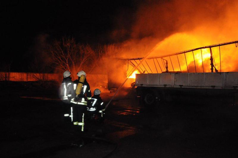 Горять п’ять вантажівок, 10 легкових автомобілів і покрівля та двоповерховій будівлі, що знаходиться поруч.