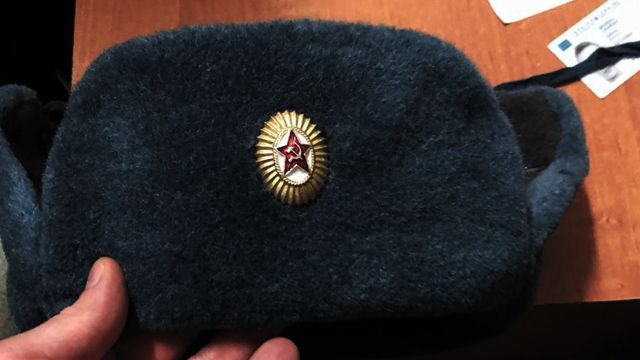 Шапку з кокардою, на якій зображено серп і молот у червоній зірці, було вилучено.