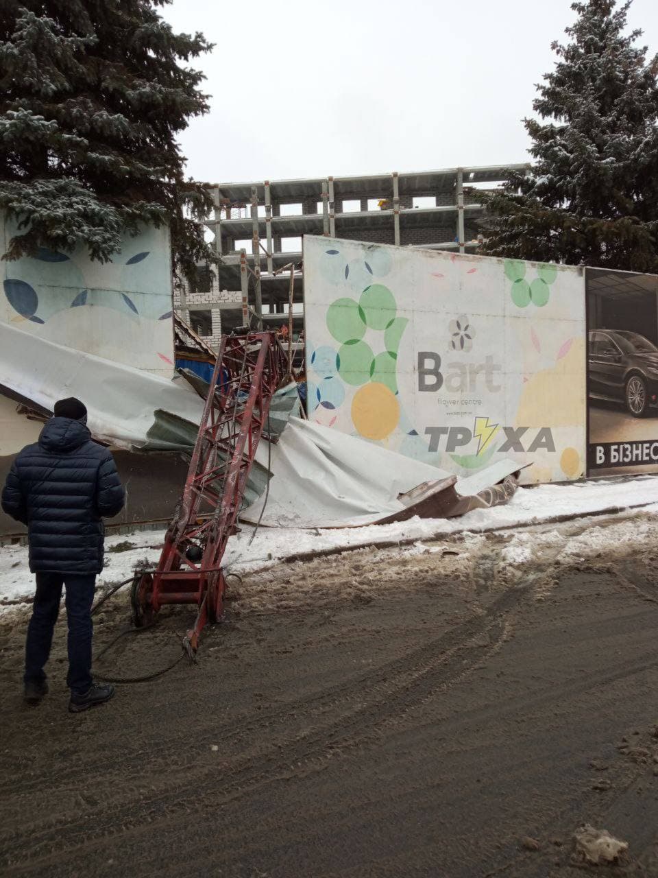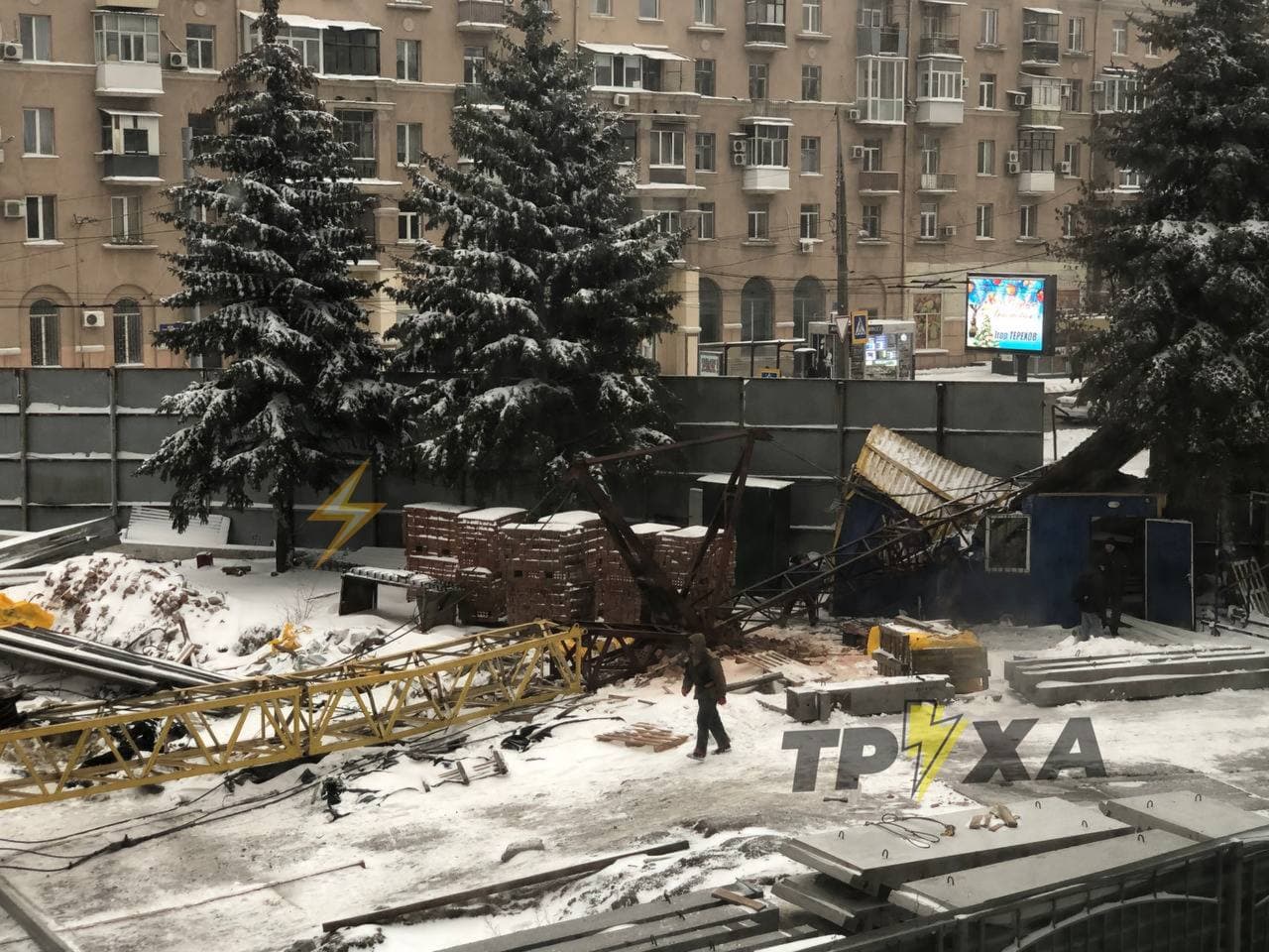 На одному із будмайданчиків у центрі Харкова вдень 13 січня впав будівельний кран. Конструкція серйозно пошкодила вагончик з будівельниками, зім’явши її дах.