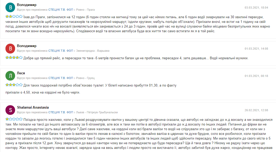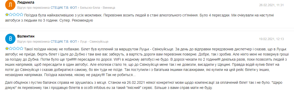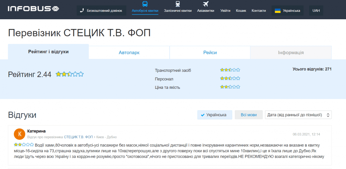 Так, на спеціалізованому сайті рейтинг перевізника становить 2,44 з п’яти можливих зірок. Серед найпоширеніших скарг пасажирів були погані автобуси, недотримання карантинних норм і хамська поведінка з боку водіїв.