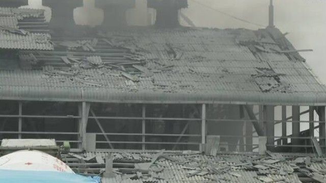 Місцевій телекомпанії вдалося зробити зйомку з неба. На записі видно, що на зовнішній стіні та на даху будівлі – великі діри, усюди піднімаються стовпи вогню та чорного диму.