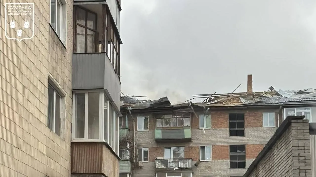 – Влучання ворожого БпЛА в центральній частині Сум. Агресор спрямував удар по житловій багатоповерхівці”, – йдеться у повідомленні.