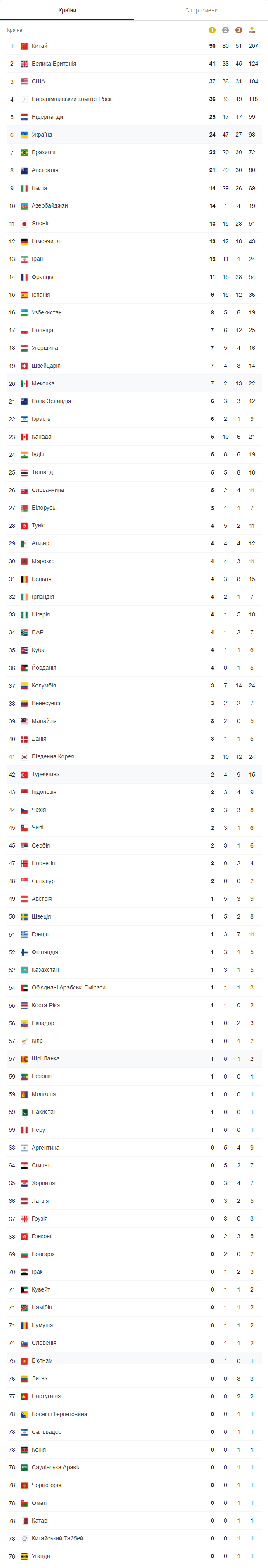 Україна стала шостою в медальному заліку Паралімпійських ігор-2020. Наші спортсмени завоювали 98 медалей, серед яких – 24 золотих, 47 срібних та 27 бронзових.