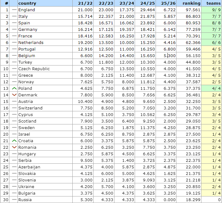 - 1. Англія – 97.561 бала (9/9 клубів продовжують виступи);