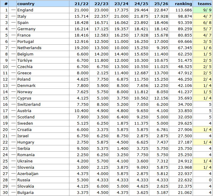 Відставання від Румунії, яка йде 24-ю та більше не має представників у єврокубках, становить тепер 0.338 балів. Відставання найближчої переслідувачки Словенії тепер зросло до 0.944 балів.