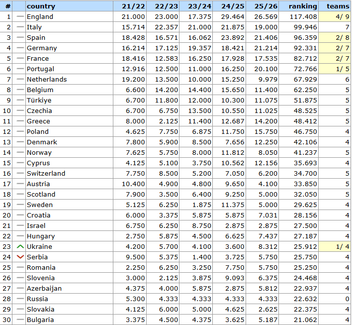 Відставання найближчої переслідувачки Сербії, яка теж вже немає представників у єврокубках, складає 0.162 балів.