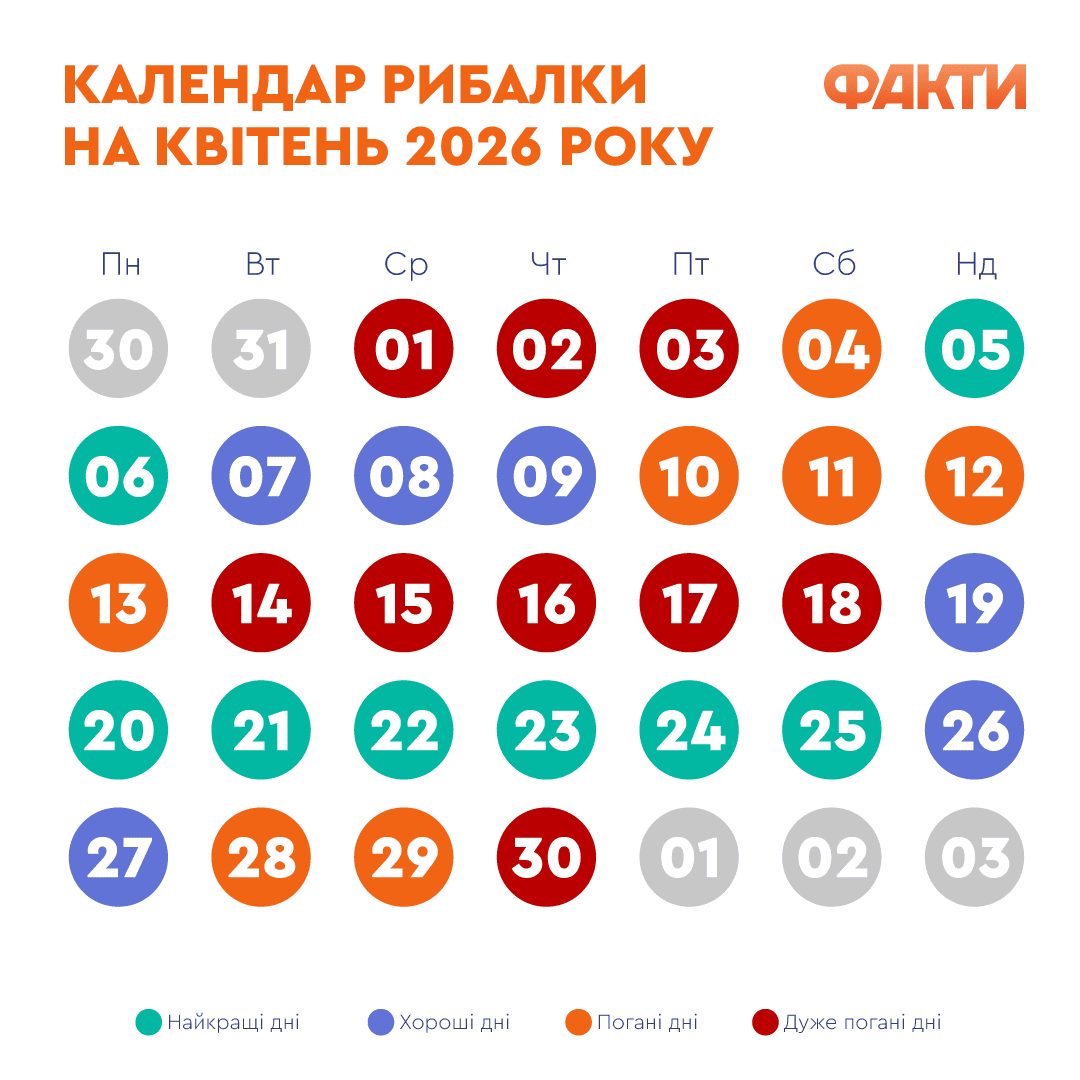 Факти ICTV підготували календар рибалки на квітень 2026 року, який допоможе визначити найвдаліші дати для виїзду на водойму.