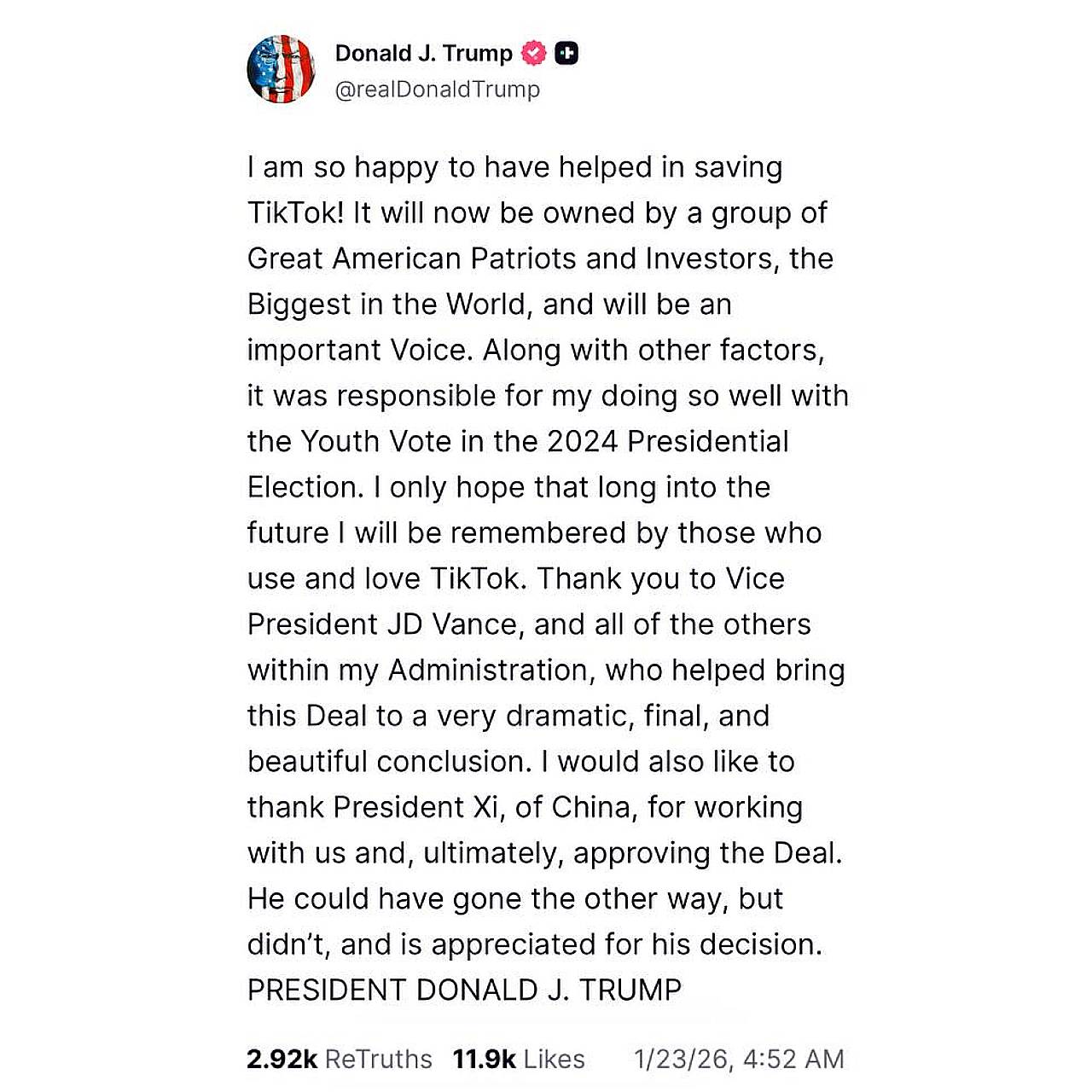 Президент США Дональд Трамп привітав завершення угоди у своїй соцмережі Truth Social. Він назвав нових власників “великими американськими патріотами” і подякував лідеру Китаю Сі Цзіньпіну за співпрацю.