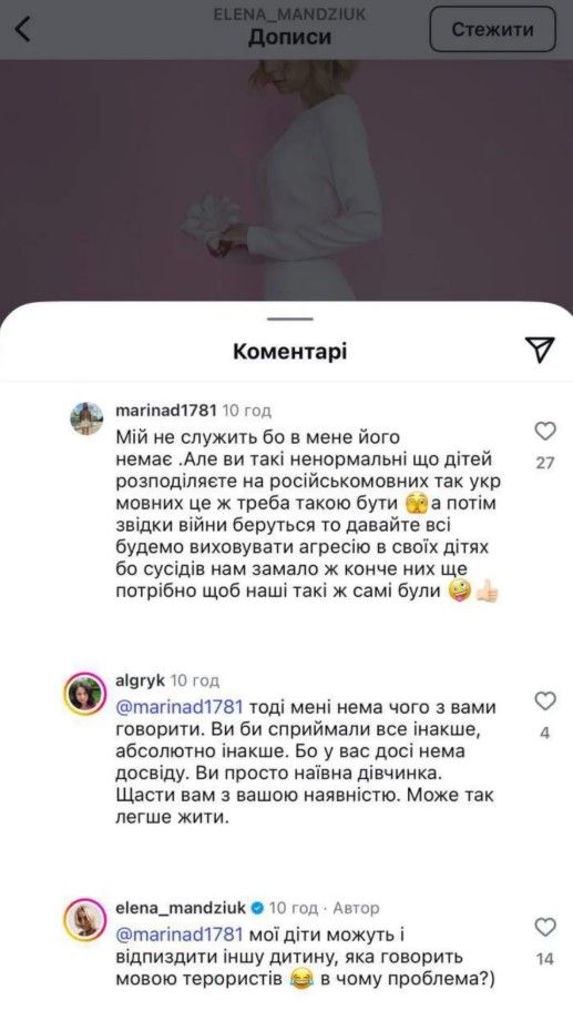 Близько місяця тому під одним зі своїх дописів Олена Мандзюк відповіла у коментарях, що її діти можуть побити іншу дитину, яка говорить мовою терористів.