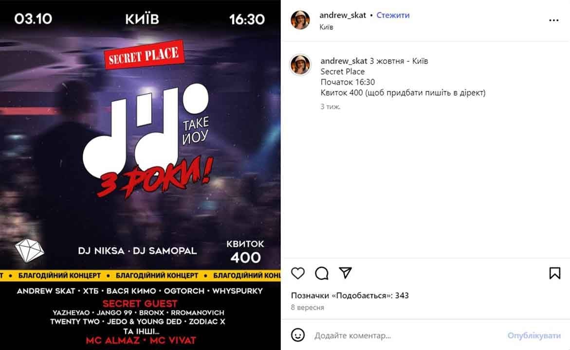 Окрім Andrew Skat, на афіші концерту було заявлено виступи ХТБ, Вася Кімо, OGTorch, whyspurky та інших реп-виконавців. Захід мав відбутися 3 жовтня у Panorama Bar о 16:30. Квитки коштували 400 грн.