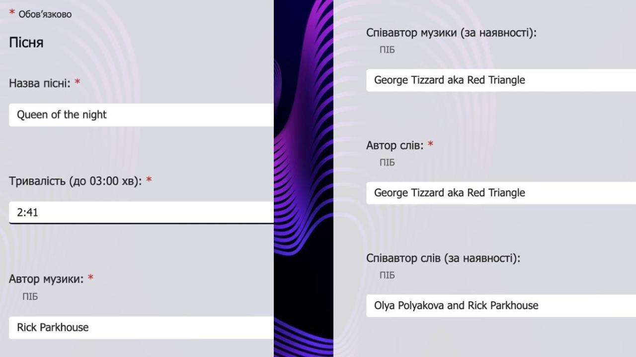 Згідно з документами, у заявці зазначена пісня Queen of the night, написана Олею Поляковою у співавторстві із Ріком Паркгаузом та Джорджем Тіззардом.
