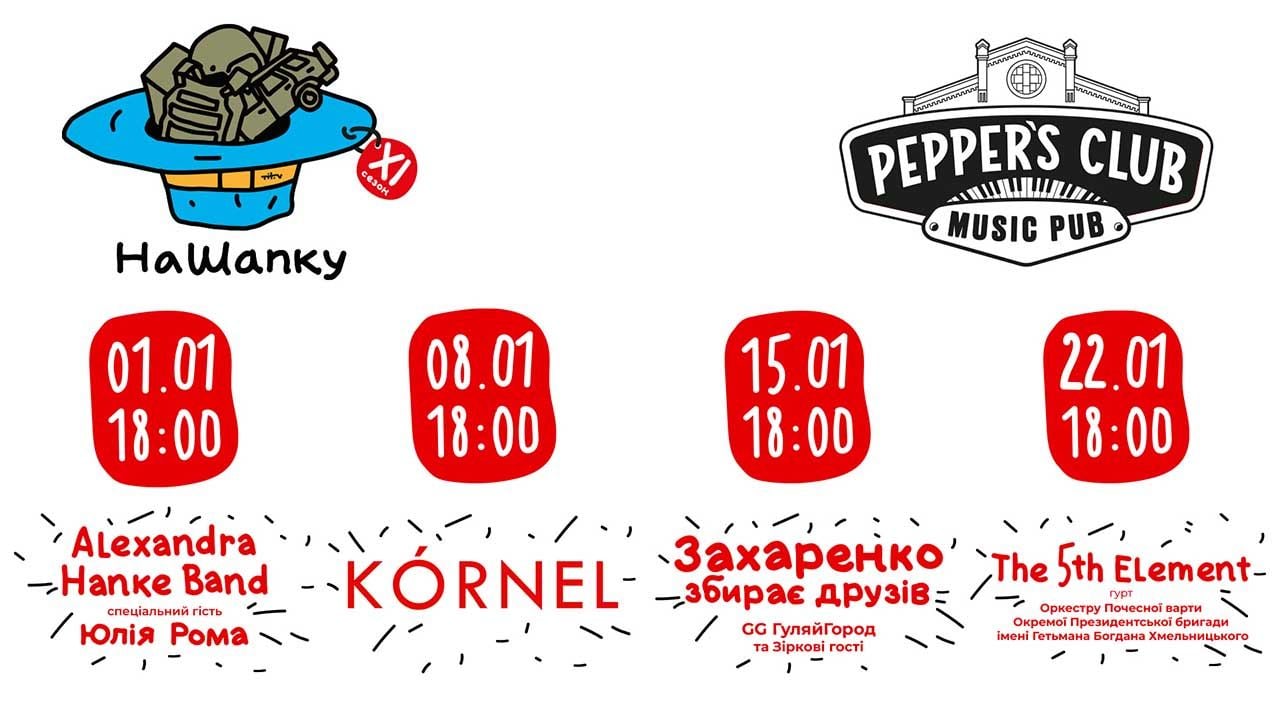 У січні Pepper’s Club продовжує проєкт #НаШапку — серію благодійних концертів із вільним входом на підтримку фонду Свої, який збирає кошти на кісткові імпланти для поранених українських захисників.