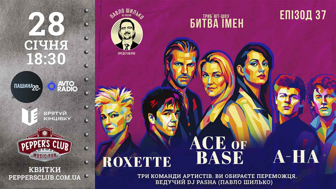 Кінець січня в Pepper’s Club — час для гучних хітів і музичних протистоянь. 28 січня тут відбудеться Пашина 20. Битва імен — концертний формат хіт-параду від шоумена Павла Шилька (DJ Паша), у якому на одній сцені зійдуться Roxette, Ace of Base й a-ha.