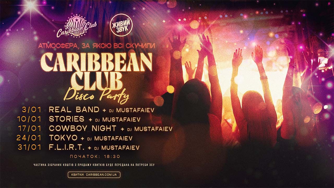 У січні клуб традиційно запрошує на Caribbean Disco Party — серію вибухових вечірок із кавер-гуртами, улюбленими хітами й танцями до пізнього вечора.