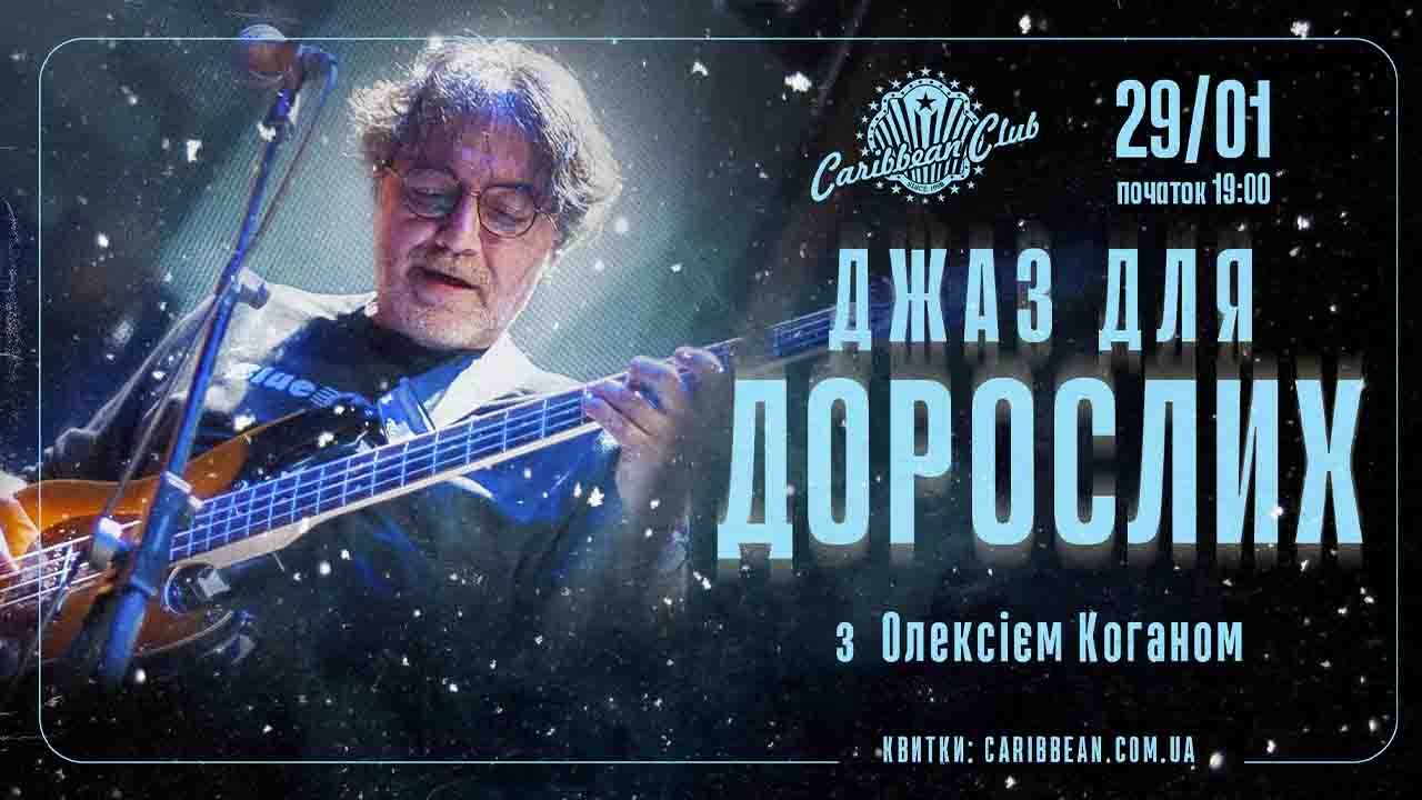 29 січня Caribbean Club запрошує на Джаз для дорослих з Олексієм Коганом — вечір, де жива музика поєднується з історіями та розмовою про джаз.