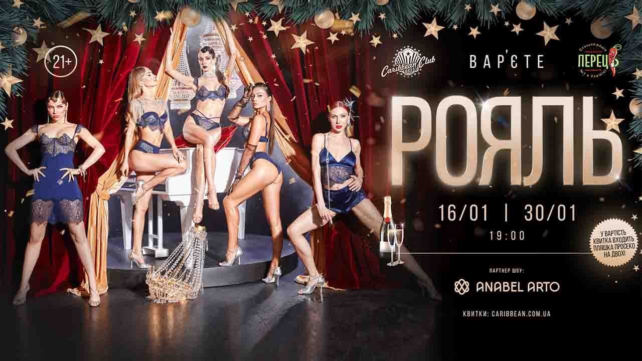 У січні Caribbean Club двічі прийматиме вар’єте Рояль — мюзикл у форматі дінер-шоу, що вже понад п’ять років збирає аншлаги в Києві. У центрі програми — яскрава й харизматична Lida Lee, а також спеціальні музичні гості й постановки хореографів проєкту Танці із зірками.