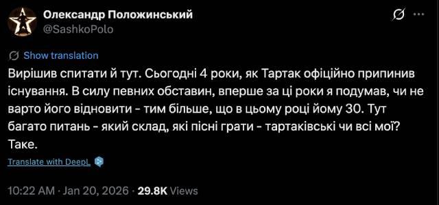 Український музикант і військовослужбовець ЗСУ Олександр Положинський замислився над можливим відновленням гурту Тартак, який офіційно припинив існування чотири роки тому. Про це артист написав у соцмережі X.
