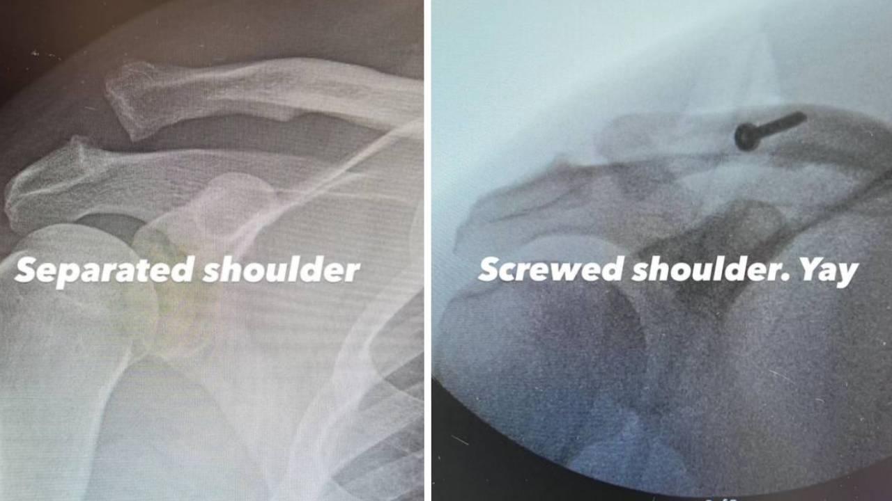 Також зірка показав рентгенівські знімки плеча до та після хірургічного втручання. На них видно металевий гвинт, який лікарі встановили в ключицю для стабілізації суглоба.