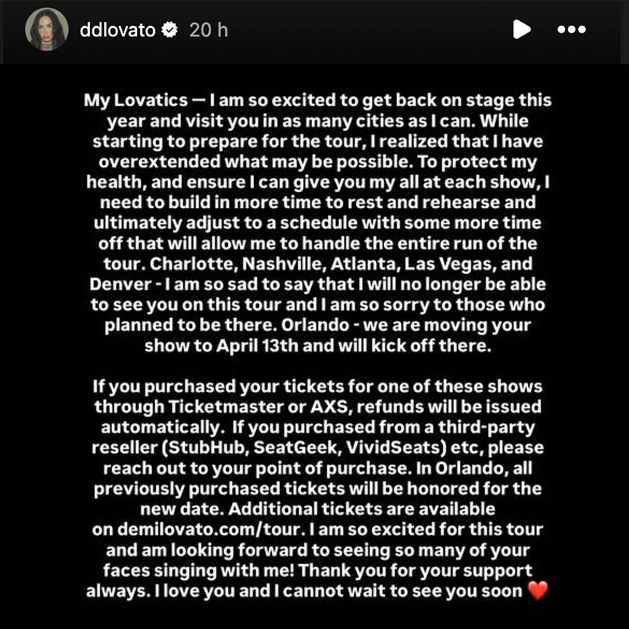 Ловато офіційно скасувала виступи, які мали відбутися у квітні в Шарлотті, Нешвіллі, Атланті, Лас-Вегасі та Денвері.