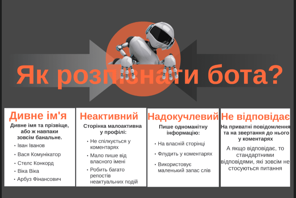 3) сайти, сторінки у соціальних мережах, створені від імені інших людей, боти;