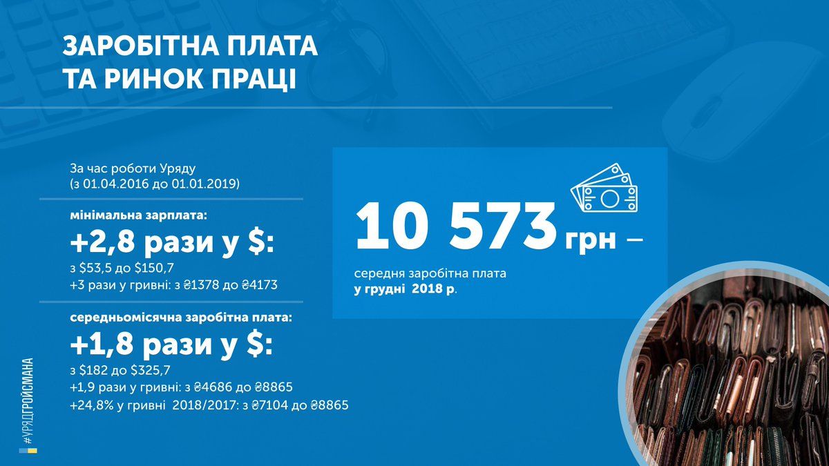 Мінімальна зарплата, як стверджує прем’єр, зросла втричі – з 1378 до 4173 грн, середня – у 1,9 рази (з 4686 до 8865 грн).