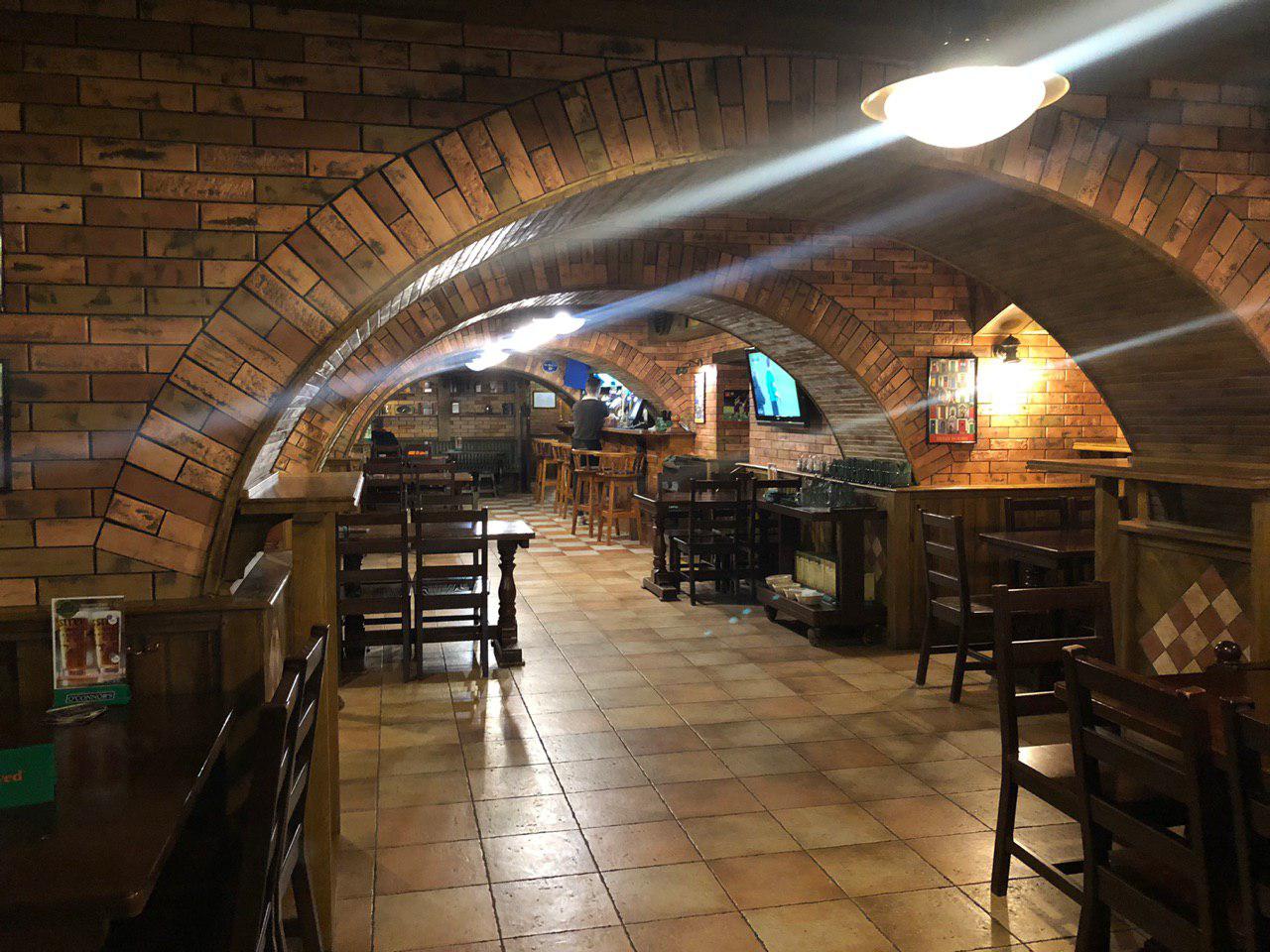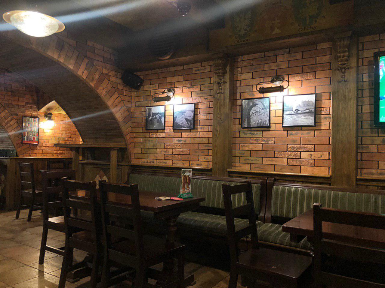 Великий пивний зал – в порівнянні з іншими, певно, у цьому найменше думали про інтер’єр – шпалери в смужку, масивні меблі, дивани обтягнуті кожзамом. По залу розвішані телевізори, встановлений проектор у центрі приміщення та невелика сцена.