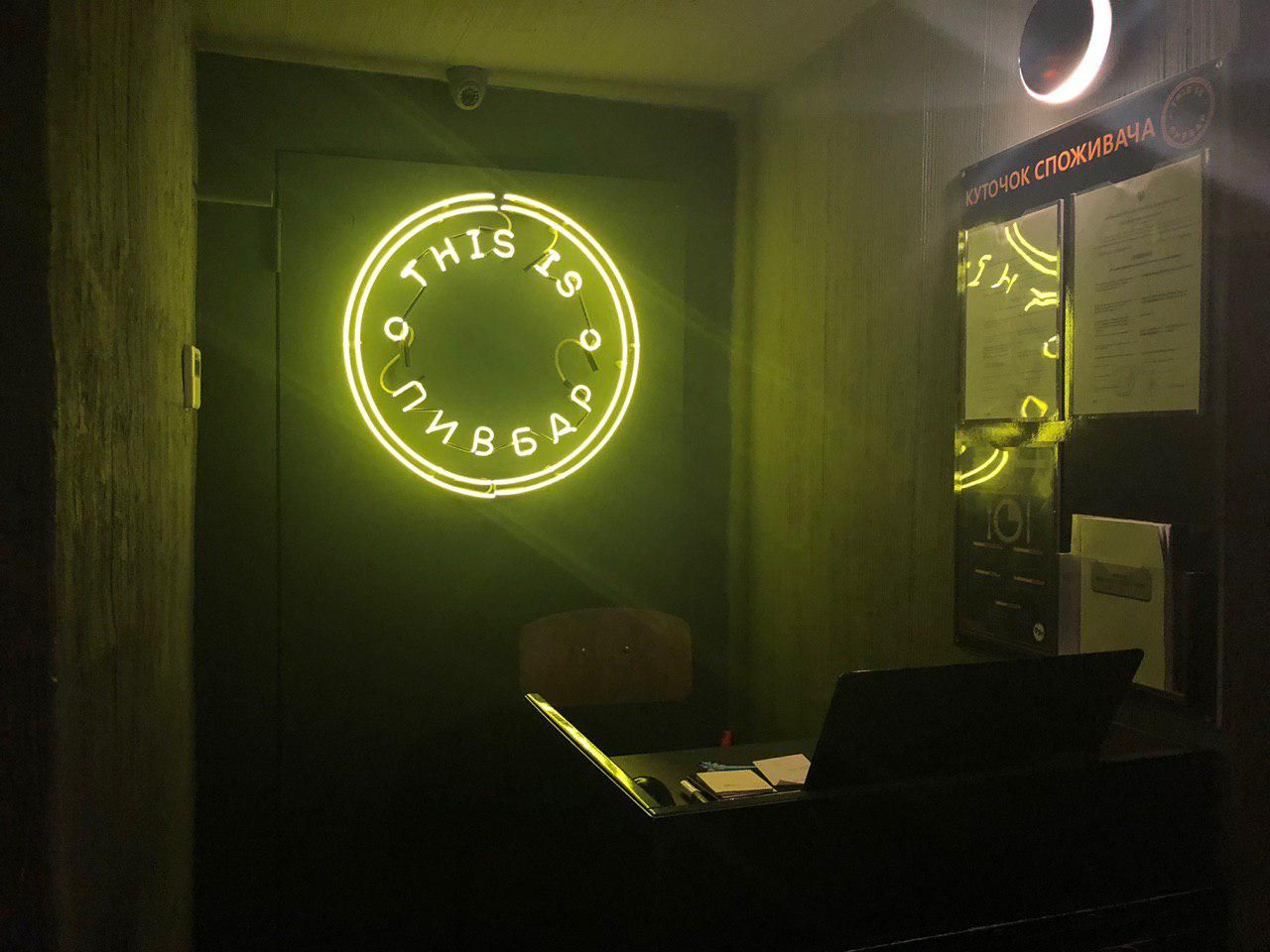 У This is Пивбар три зали – великий, середній та малий. Інтер’єр оформлено у стилі лофт, приміщення підсвічується лише висячими лампочками, тож освітлення тут доволі темне. Між залами за скляною стіною знаходиться охолоджувальний апарат для пива.