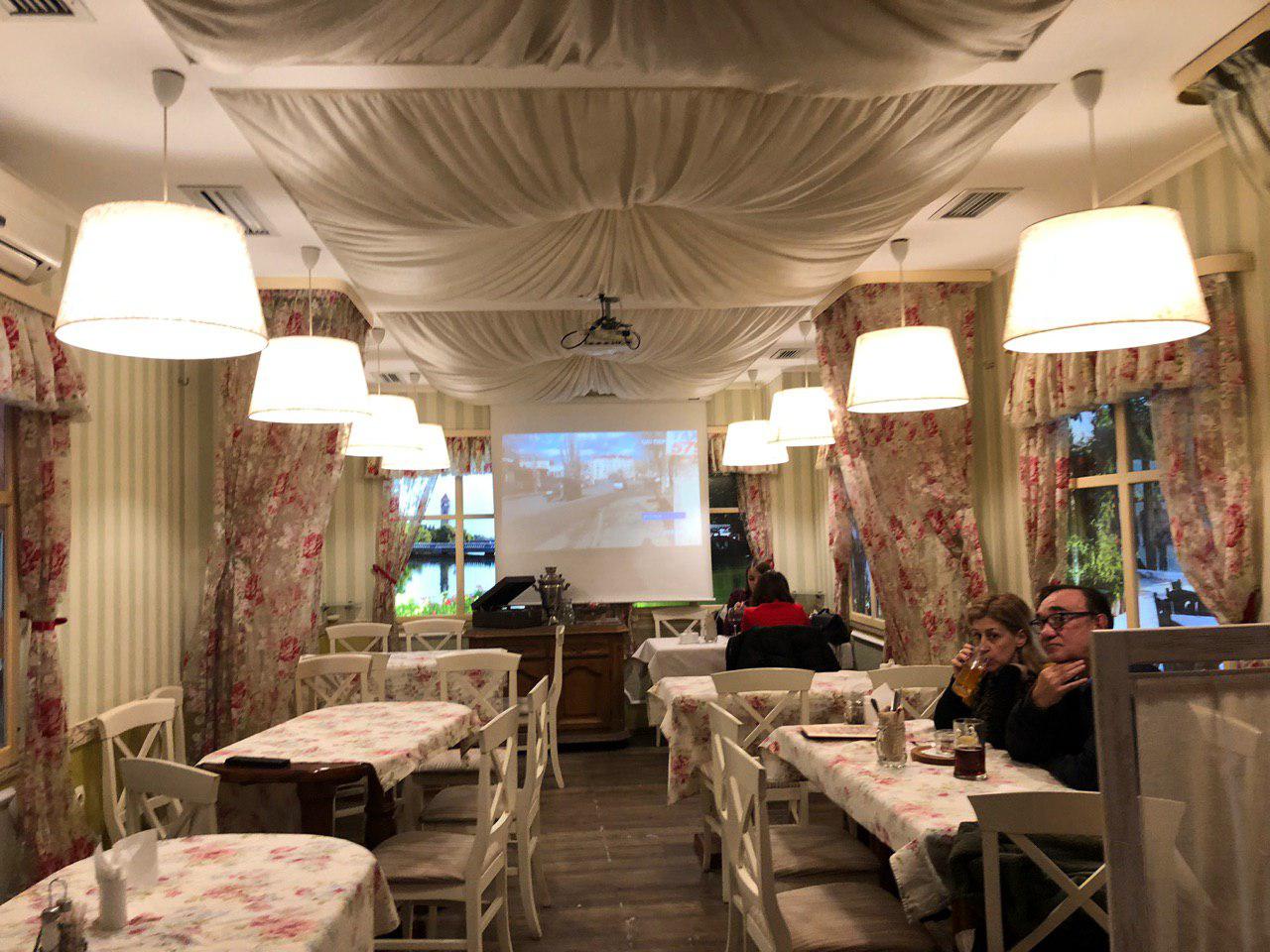 Ресторанний зал розрахований на 30 посадочних місць, він оформлений у стилі прованс – абажурні лампи, лже-вікна, круглі столи зі скатертинами, а стеля прикрашена тканиною.