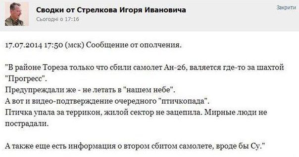 Одне з перших повідомлень про катастрофу літака з’явилося на сторінці Зведення від Стрєлкова Ігоря Івановича у соцмережі Вконтакте. Тоді терористи заявляли про те, що збили літак Ан-26 в районі Тореза, адже “попереджували” не літати там.