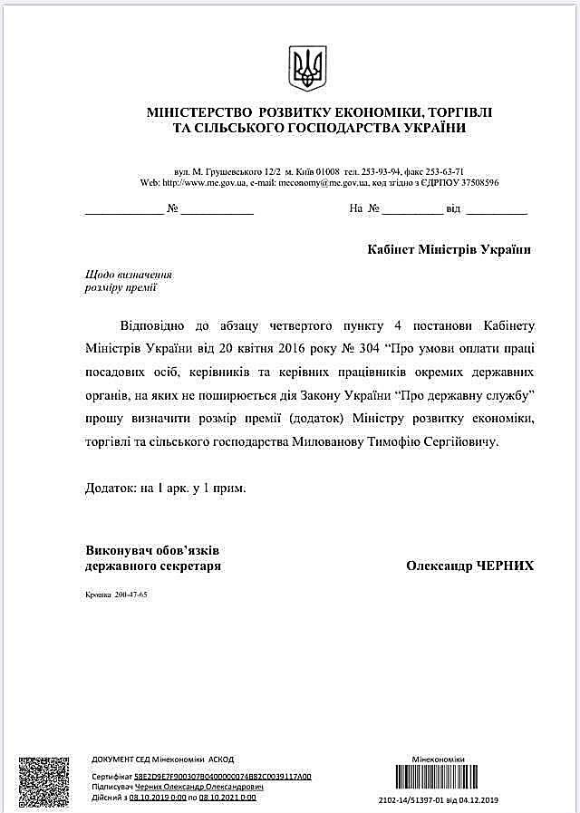Кабінету міністрів пропонують погодити премію міністру розвитку економіки, торгівлі та сільського господарства Тимофію Милованову у розмірі 1630%.