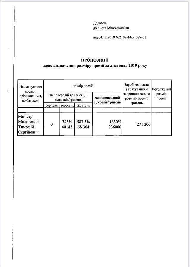 Загалом зарплата Милованова за листопад 2019 року може скласти 271,2 тис. грн.