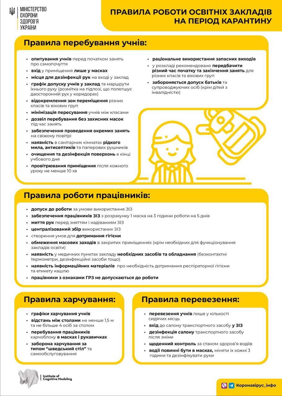 Наприклад, у рекомендаціях головного санітарного лікаря Віктора Ляшка йдеться про те, що пересування учнів між класами потрібно мінімізувати і збільшити відстань між партами, зменшити кількість людей в класах тощо.