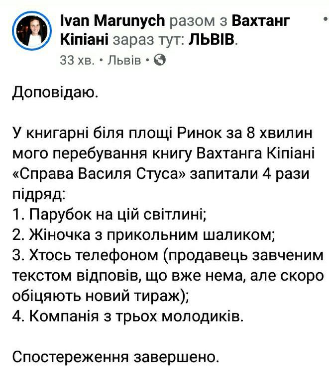 Вахтанг Кіпіані повідомив, що після рішення суду книгу розкупили за лічені хвилини. Однак видавництво додруковуватиме новий наклад, поки рішення суду не набуло чинності. Його очікують 2 листопада.