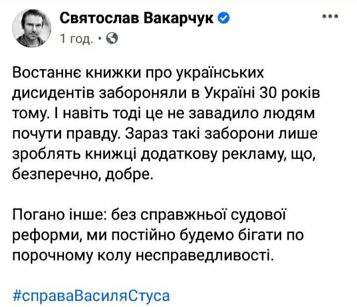 19 жовтня Дарницький районний суд Києва заборонив поширювати книгу про українського поета-дисидента Василя Стуса без дозволу депутата від партії Опозиційна платформа – За життя Віктора Медведчука.