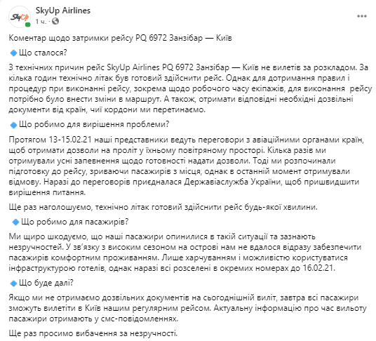 Пізніше SkyUp на своїй сторінці у Facebook пояснила, чому літак досі не вилетів із Занзібару.